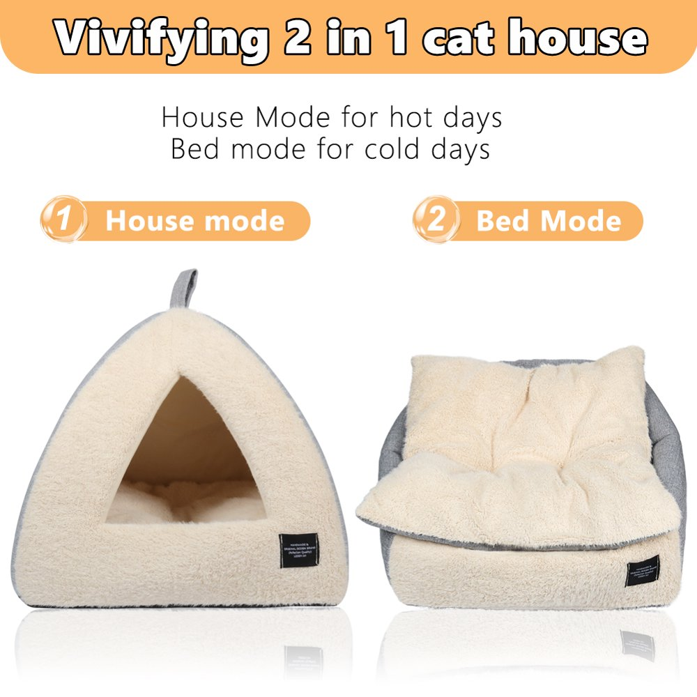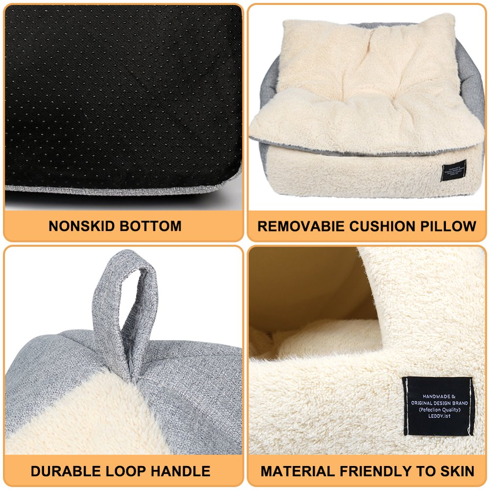 - Smart Bed Design: With a triangular entrance and cave-like design, the 2-in-1 cat house enclosed pet bed functions like a soft cat/dog house and the top folds down to provide a bed for your beloved kitty or puppy-like structure turning this bed into the perfect hideaway and a quiet, private place to sleep – Leather handle on top makes it easy to move when needed.
