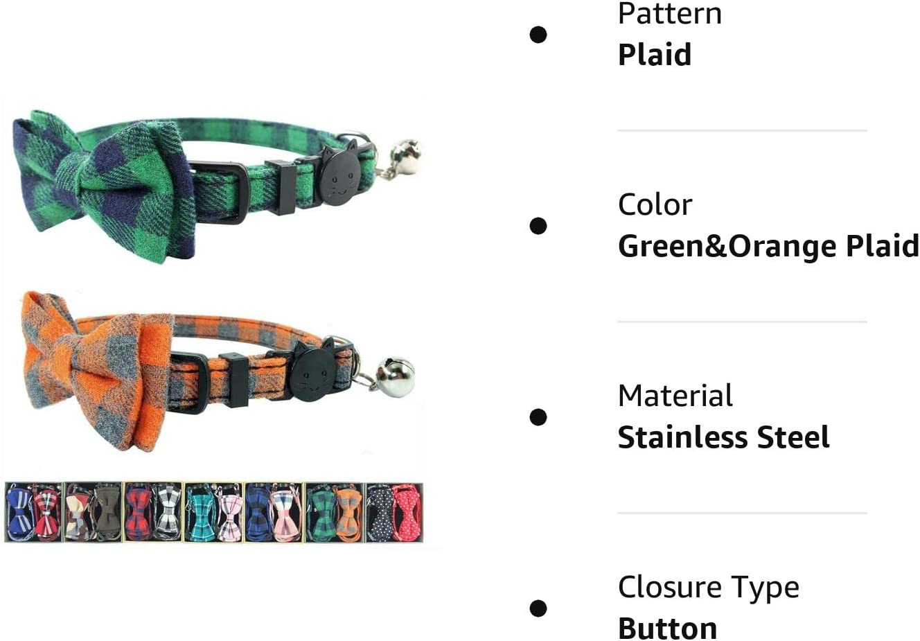 Cat Collar Breakaway with Bell and Bow Tie, Plaid Design Adjustable Safety Kitty Kitten Collars Set of 2 PCS (6.8-10.8in) (Green&Orange Plaid)Take your cat outdoors with a adorable and attractive collar. With style and strength, the high quality soft material ensures long lasting comfort. Featuring a bowtie, a safety quick release cat clip and protect bell.