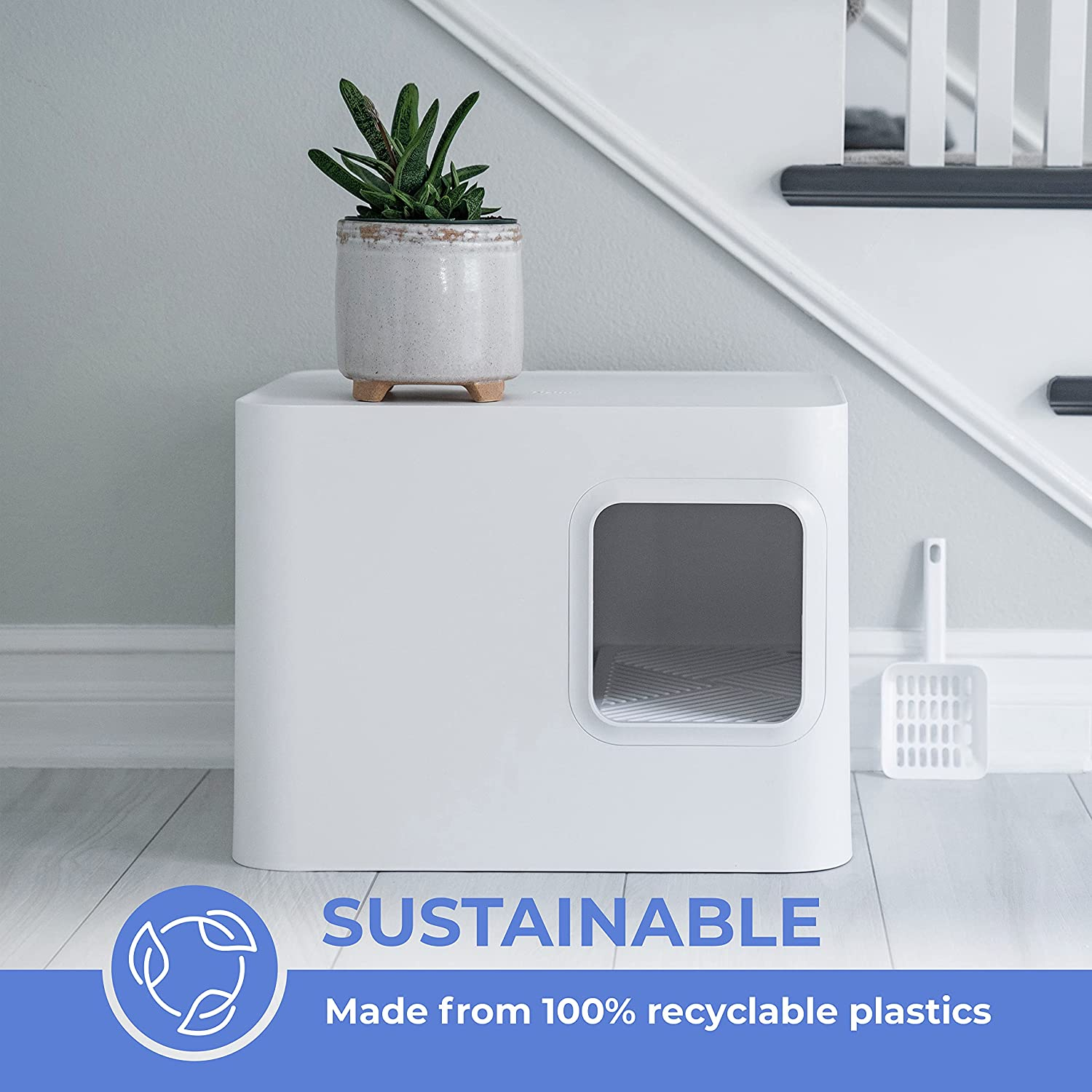 Made from 100% recyclable ABS plastic, our design incorporates a handy litter catcher, so you no longer have to worry about the mess your furbaby leaves behind. The closed-structure box is sleek and stylish but also combats nasty smells by blocking the odor in the tray. Our tray is easy to clean with a simple rinse-and-wipe solution, which will keep you feeling zen every day.