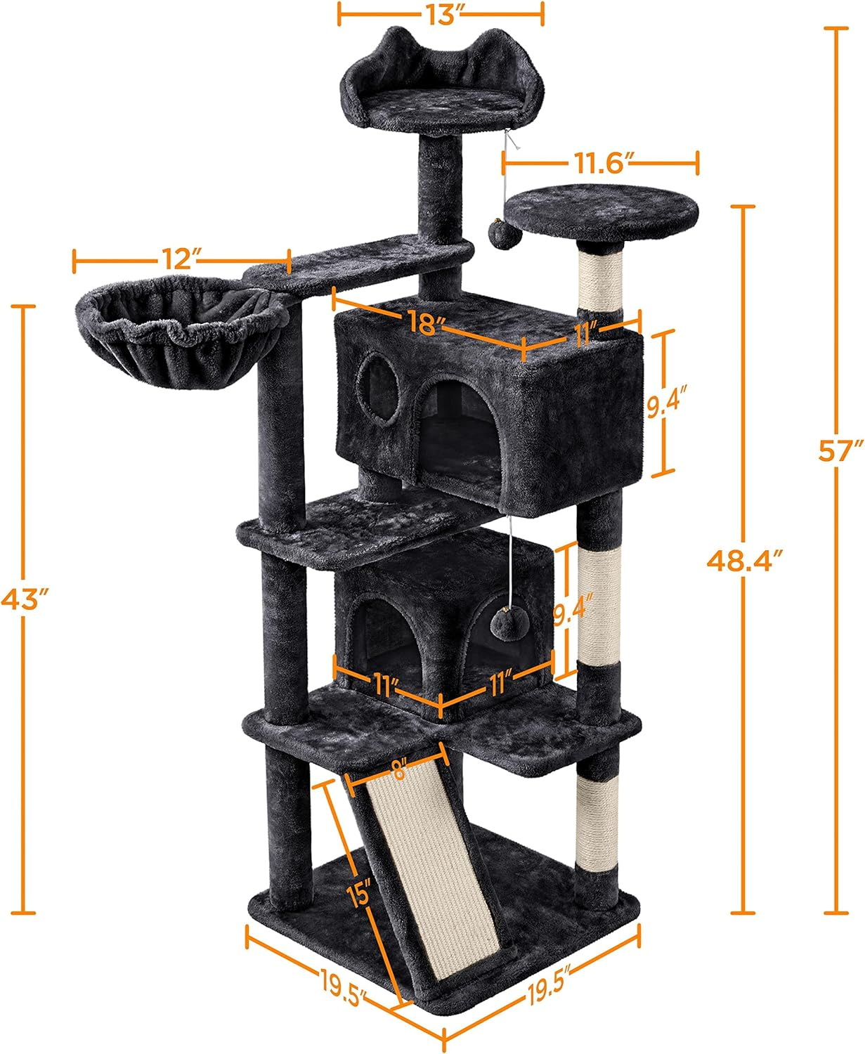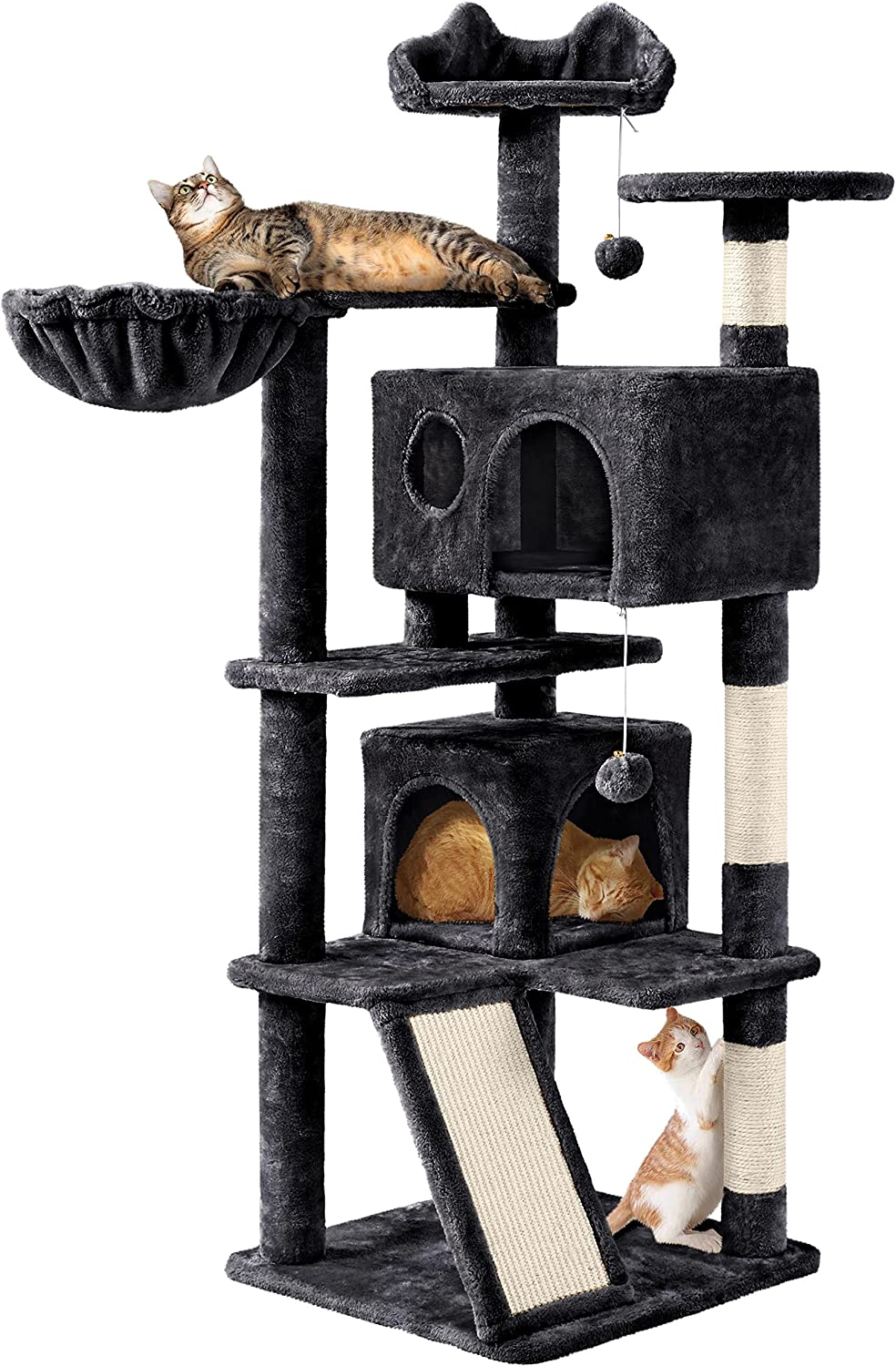 This multi-tier 57” tall cat tree tower can keep your kittens from scratching your delicate furniture and provides them with a space to have fun and nap. It is constructed of safe and sturdy particleboard with pet-friendly soft, plush fabric covering. The natural sisal rope covered posts, hanging fur balls, comfortable perches, fluffy condos are fit for your kittens to climb, scratch, play and lounge.