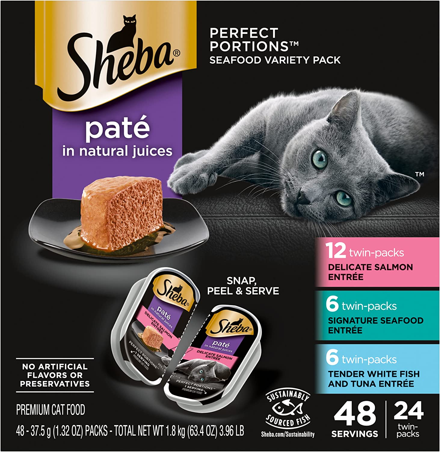 • Contains twenty-four (24) 2.6 oz. twin packs (48 servings total) of SHEBA PERFECT PORTIONS Paté Wet Cat Food Variety Pack: (6) Signature Seafood Entrée, (12) Delicate Salmon Entrée, and (6) Tender Whitefish & Tuna Entrée