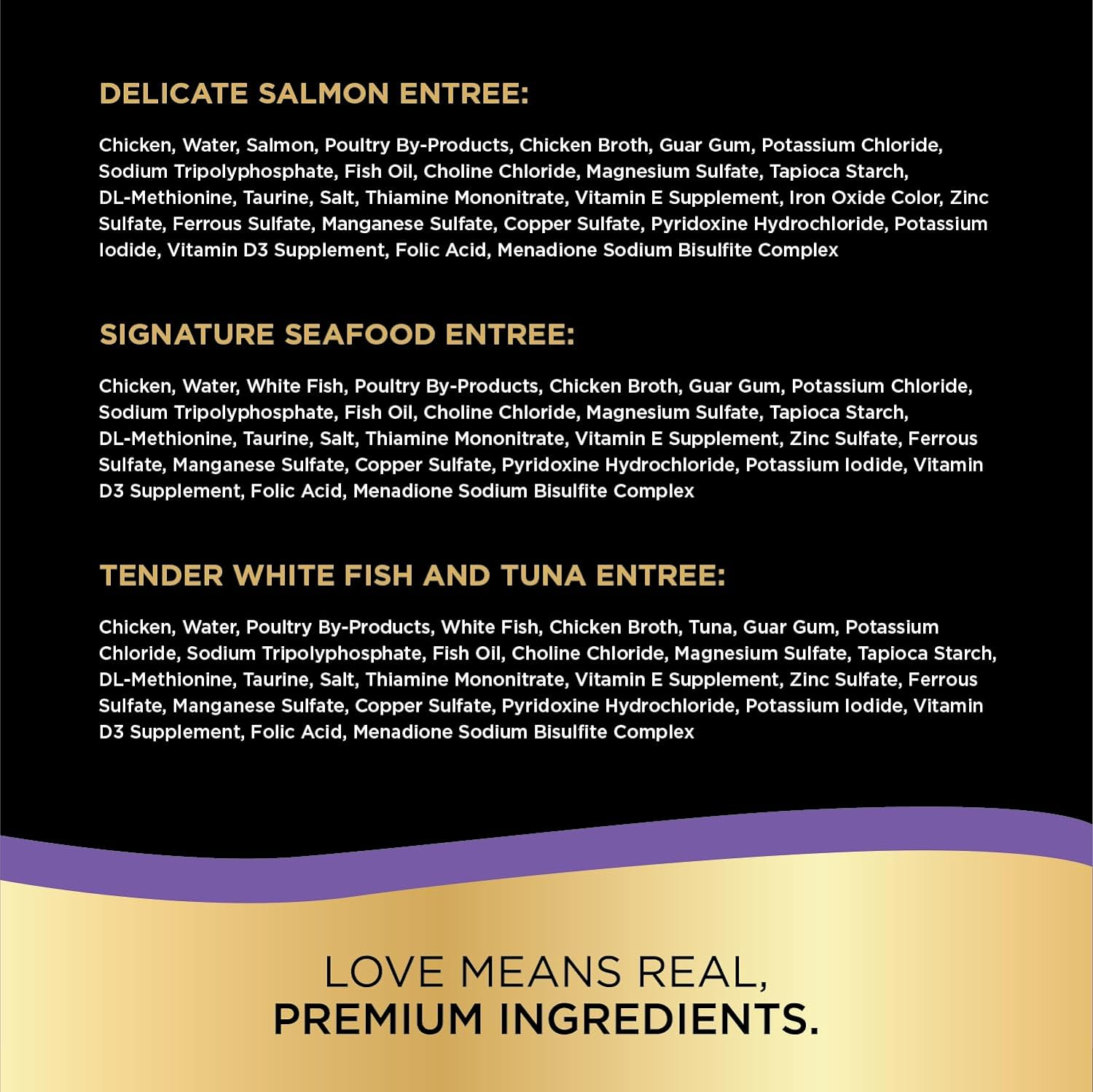 • Variety pack contains three delectably soft cat food entrées with the light texture and irresistible seafood flavor cats love