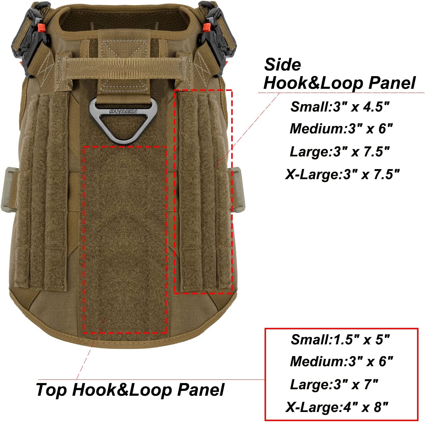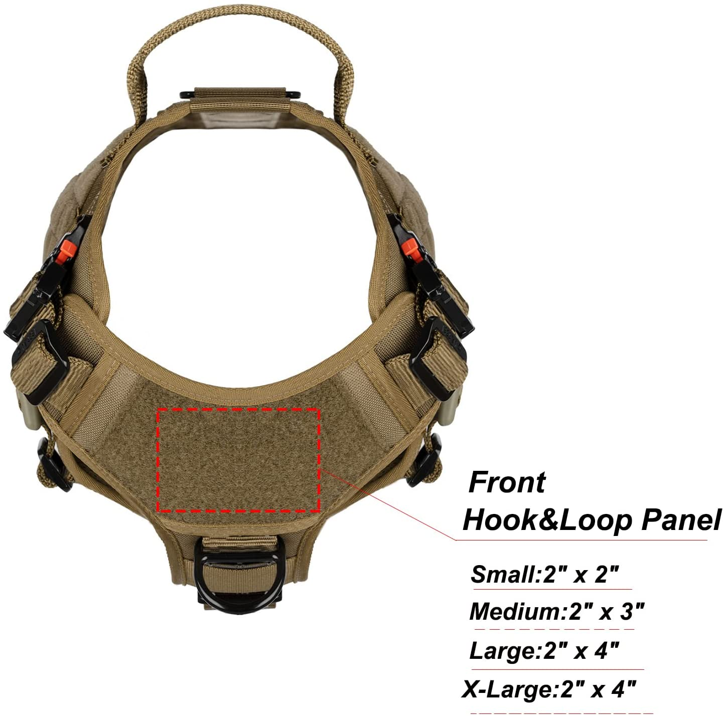 - [DOG IDENTIFIED]:Three 1″ Strips of Hook and Loop Panel Sewn onto Both in the Formation of MOLLE(size in Small :3″x4.5″ ; Medium :3″x6″ ;Large/X-large/XX-Large :3″x7.5″ ); One Strip of loop panel Sewn Along the Back of harness with different wide in each size ( Small: 2″ ; medium/Large:3″ ;X-large/XXL:4″);One Square Loop panel Sewn on The Front Chest (Size in small:2″x 2″ ; Medium:2″x 3″ “; Large/X-large:2″x 4″ ; XX-Large:3″x4”) ,You Can Attach Many Patch to Identify Your Dog